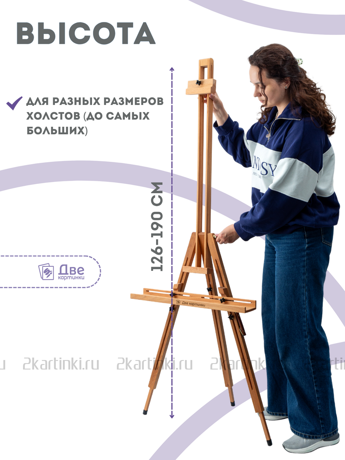 Приятный на вид и ощупь ,высокий мольберт -190см .По желанию можно опускать или поднимать на свой уровень .Очень удобная полочка для красок и кистей.В целом крепкий и удобный мольберт ,можно сложить и взять с собой ,но достаточно увесистый из-за дерева.